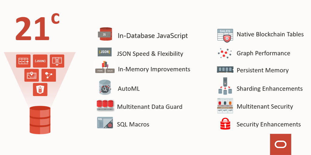 - Bellek İçi Veritabanı Geliştirmeleri: Aynı tabloda hem satır hem de sütun formatlarını desteklemektedir ve her ikisi de eşzamanlı olarak aktif ve işlemsel açıdan da tutarlı niteliktedir. Oracle Veritabanı 21c, nesnelerin Bellek İçi Sütun Saklama alanına yerleştirilmesini ve buradan çıkartılmasını otomatik olarak yöneterek verimliliği basitleştiren ve artıran ve ardından kullanıcı düzenlerini ve hareketlerini takip edip nesneleri sütun saklama alanından çıkartan Kendi Kendini Yöneten Bellek İçi Sütun Saklama alanına sahiptir. Ayrıca sütunlar, kullanım düzenlerine bağlı olarak otomatik bir şekilde sıkıştırılmaktadır.