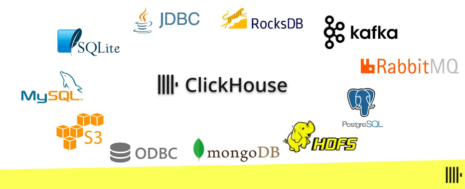 Ayrıca farklı veritabanları ile Integration için Table Engine çeşitleride vardır. OLAP sistemler diğer sistemlerden beslendiği için CLickHouse bu konuda oldukça zengin bir ekosistem oluşturmuş ve neredeyse tüm Veritabanları için bir Table Engine içermektedir.